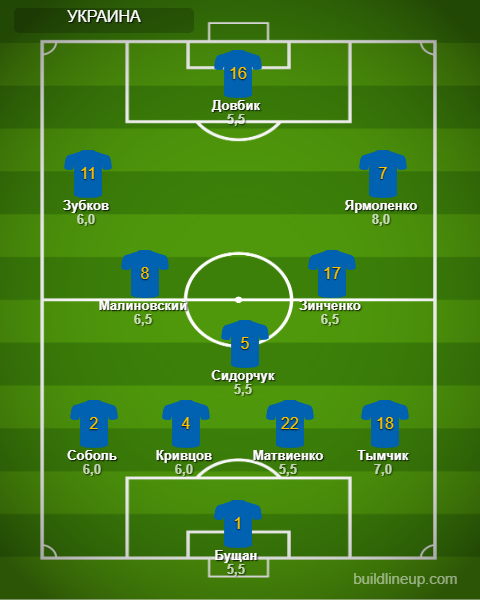 Украина: Бущан (Ризнык, 46) - Тымчик, Кривцов, Матвиенко, Соболь (Коваленко, 68) - Зинченко, Сидорчук (Степаненко, 46), Малиновский (Гармаш, 78) - Ярмоленко, Довбик (Яремчук, 46), Зубков (Цыганков, 61).