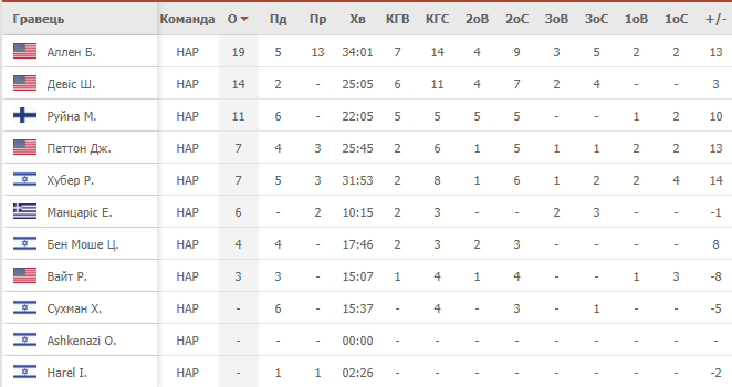 «Хапоэль Эйлат»: Аллен (19+5 подборов+13 передач), Бен Моше (4), Вайт (3), Руйна (11+6 подборов), Хубер (7), Ашкенази О., Харел, Манцарис (6), Дэвис (14), Петтон (7), Сухман.