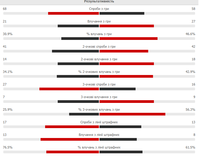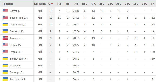 «Киев-Баскет»: Скапинцев (10), Вашингтон (10+11 подборов), Кеффи (7+7 передач), Войналович, Вудсон (3), Гарретт (15+7 подборов), Аникиенко (9), Томпсон (8), Тиртишник.