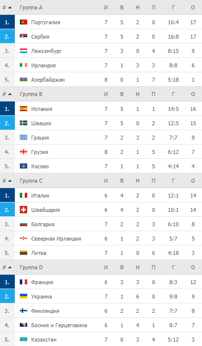 Примерно аналогичная ситуация в группе B. Испания вышла на первую позицию после поражения Швеции от Грузии. В последнем туре Испания (16) и Швеция (15) будут играть между собой, и фаворита группы дома устроит ничья.