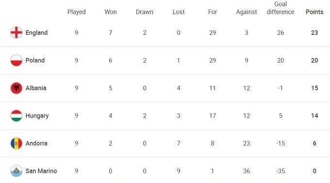 Польша, которая с первой минуты матча с Андоррой играла в большинстве, одержала уверенную победу 4:1, и обеспечила себе как минимум второе место в группе и выход в плей-офф. Шансы обойти Англию призрачные: за тур до финиша поляки отстают на 3 очка и имеют на 6 голов хуже разницу мячей.