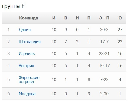 Дания впервые потеряла очки, но уверенно финишировала первой. В стыки идет Шотландия.