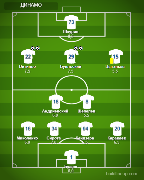 «Динамо»: Бущан - Караваев, Кендзера, Сирота, Миколенко - Шепелев (Гармаш, 46), Андриевский - Цыганков (Антюх, 72), Буяльский (Леднев, 77), Витиньо (де Пена, 72) - Шкурин (Кулач, 65).