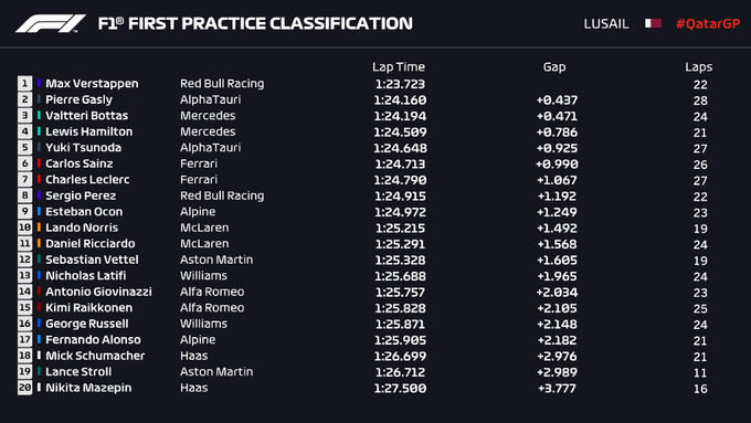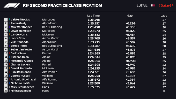 Во второй тренировке быстрейшим был уже Валттери Боттас. Отметим Гасли, который в двух практиках показал 2-е время. Хэмилтон снова был 4-м.