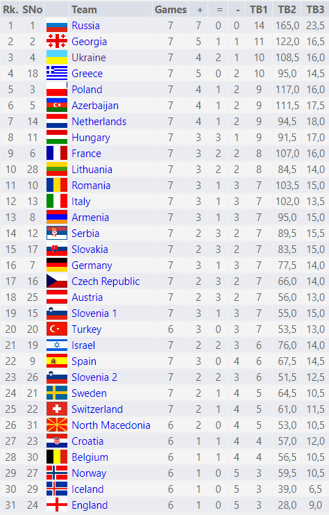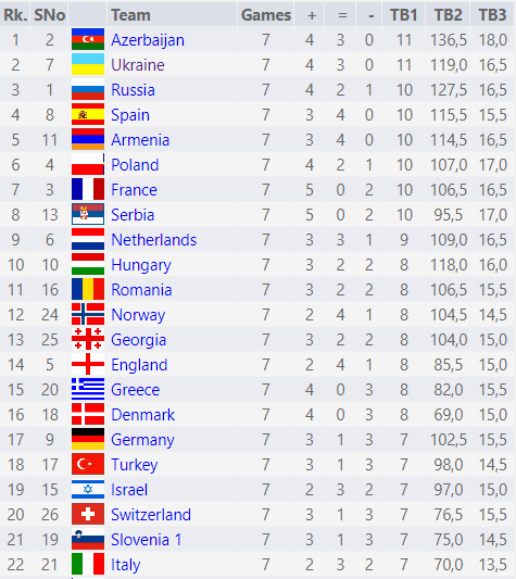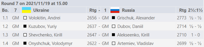 В матче 7-го тура Украина выиграла у России со счетом 2.5:1.5. Три партии завершились вничью. Победу сборной Украины принес 19-летний Кирилл Шевченко, который обыграл россиянина Кирилла Алексеенко.