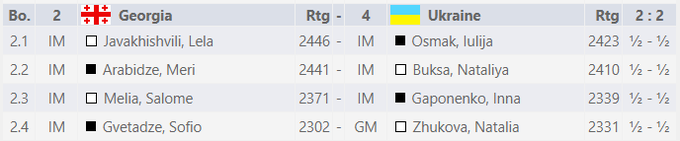 Женская сборная Украины в 7-м туре сыграла вничью с Грузией (2:2) и делит 3-ю позицию с командой Греции (по 10 очков).