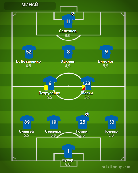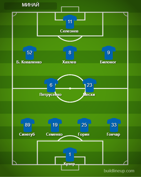 «Минай»: Кучер - Гончар, Горин, Семенко, Синегуб - Месхи, Петрусенко - Билоног (Байдал, 76), Хахлев, Б. Коваленко (Кобак, 76) - Селезнев (Вишневский, 56).