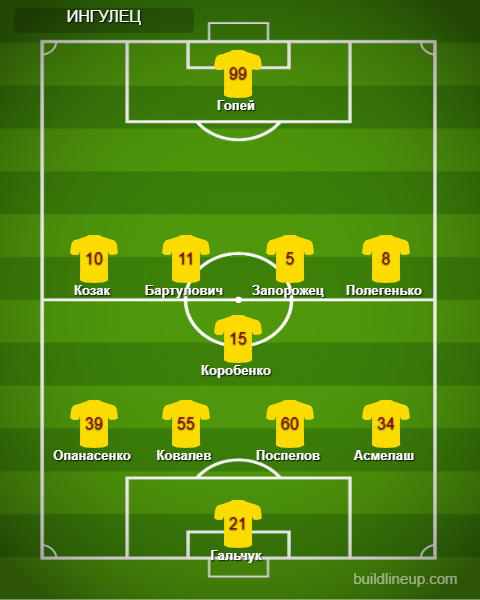 «Ингулец»: Гальчук - Асмелаш, Поспелов, Ковалев, Опанасенко (Головкин, 83) - Коробенко (И. Коваленко, 46) - Полегенько, Запорожец, Бартулович (Лупашко, 46), Козак (Шарай, 62) - Гопей (Плохотнюк, 62).