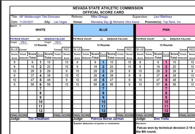 Записки судей: Патрис Вольны (Канада) – Эскива Фалькао (Бразилия) – 56:58, 58:56, 57:58.