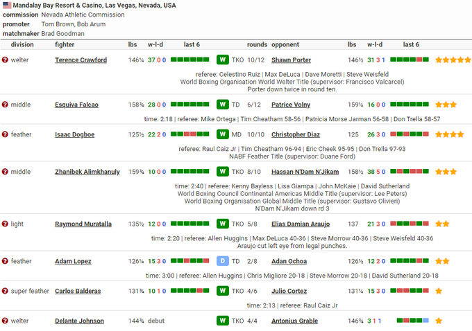 Главным событием шоу стал поединок чемпиона мира по версии WBO в полусреднем весе (до 66,7 кг) Теренса Кроуфорда (37–0, 28 KO). Американец успешно провел свою пятую защиту пояса WBO против претендента Шона Портера (31–3–1, 17 KO).