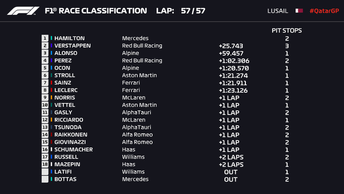 Нельзя не отметить невероятного Фернандо Алонсо. Опытный испанец с одним пит-стопом сумел сдержать Переса и финишировал 3-м! Алонсо не был на подиуме с 2014 года. Великолепный пилотаж 2-кратного чемпиона мира. И хороший этап для Альпин, ведь напарник Эстебан Окон завершил этап 5-м.