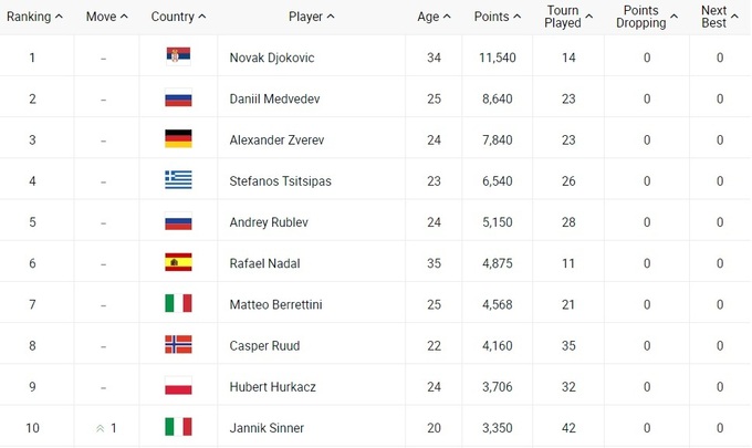 В первой десятке состоялось лишь одно изменение – Янник Синнер, который в качестве запасного одержал одну победу, поднялся на десятую строчку, вытеснив канадца Феликса Оже-Альяссима.