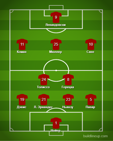 «Бавария»: Нойер - Павар, Ньянзу (Тилльман, 84), Л. Эрнандес (Сарр, 46), Дэвис - Горецка, Толиссо - Сане (Ричардс, 87), Мюллер, Коман (Рока, 67) - Левандовски.