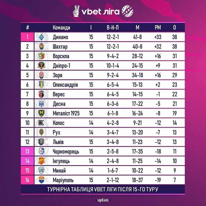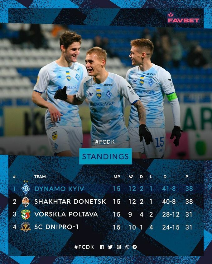 Турнирная таблица УПЛ. Динамо впереди Шахтера на 1 мяч на экваторе сезона