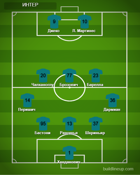 «Интер»: Ханданович – Шкриньяр, Раноккья, Бастони – Дармиан (Д'Амброзио, 78), Барелла (Видаль, 78), Брозович, Чалханоглу (Сенси, 86), Перишич (Димарко, 86) – Мартинес (Корреа, 68), Джеко.