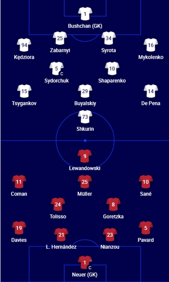 Бавария: Нойер, Павар, Ньянзу, Эрнандес, Дэвис, Горецка, Толиссо, Сане, Коман, Мюллер, Левандовски