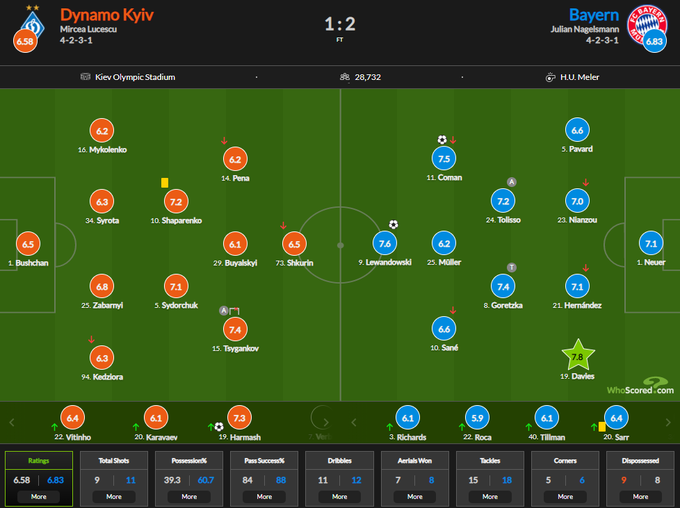 WhoScored: Цыганков и Гармаш стали лучшими у Динамо в игре против Баварии