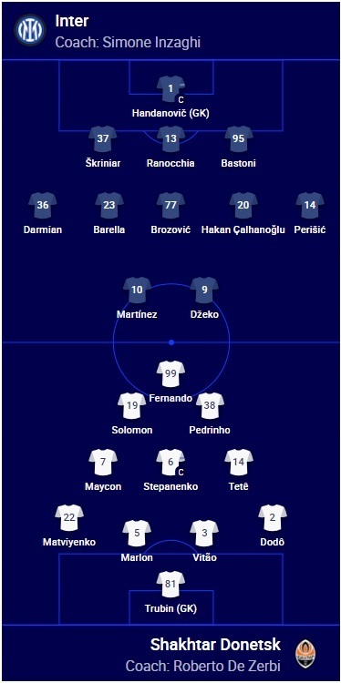 «Интер»: Ханданович – Шкриньяр, Раноккья, Бастони – Дармиан, Барелла, Брозович, Чалханоглу, Перишич – Джеко, Мартинес
