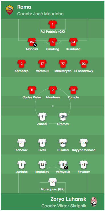 «Рома»: Патрисиу, Кумбула, Смоллинг (Ибаньес, 69), Манчини, Эль-Шаарави (Залевски, 69), Мхитарян (Миссори, 79), Верету, Карсдорп, Дзаньоло (Шомуродов, 69), Абрахам (Майораль, 76), Карлес Перес
