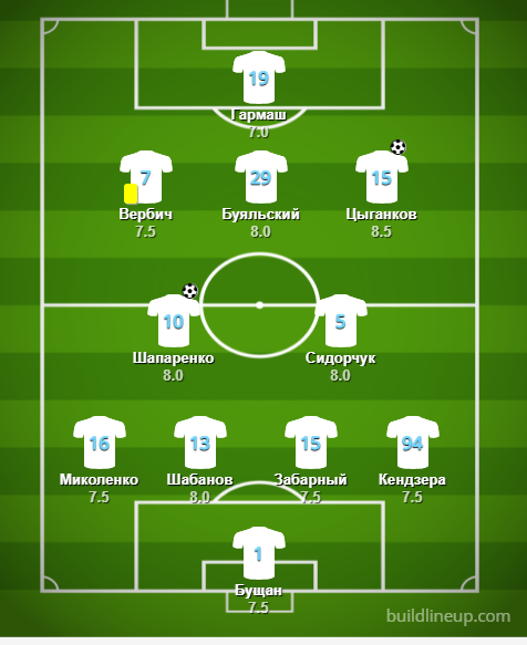«Динамо»: Бущан, Сидорчук, Вербич (Де Пена, 62), Шапаренко, Шабанов, Цыганков (Антюх, 90+4), Миколенко, Гармаш (Шкурин, 76), Забарный, Буяльский, Кендзера (Караваев, 76)