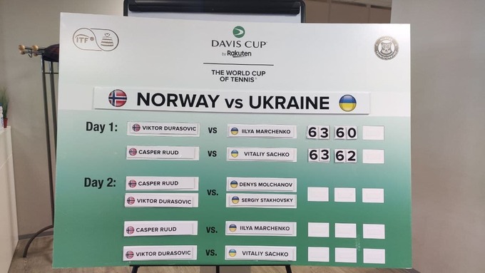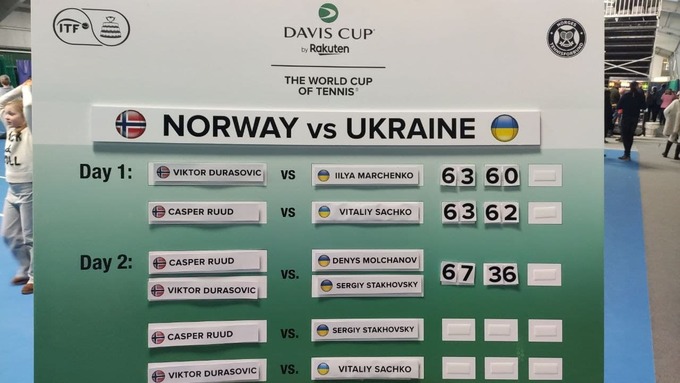 Каспер Рууд уверенно победил Виталия Сачко (6:3, 6:2), и Норвегия ведет после первого дня со счетом 2:0.