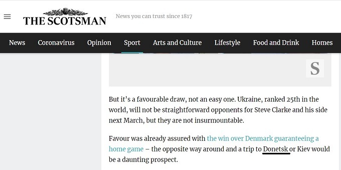 Еще одно ведущее шотландское издание, «The Scotsman», довольно трезво оценило силу сборной Украины, но при этом показало вопиющее незнание скорее даже не футбольных, а политических реалий нашей страны – они уверены, что игра могла бы пройти в Донецке: