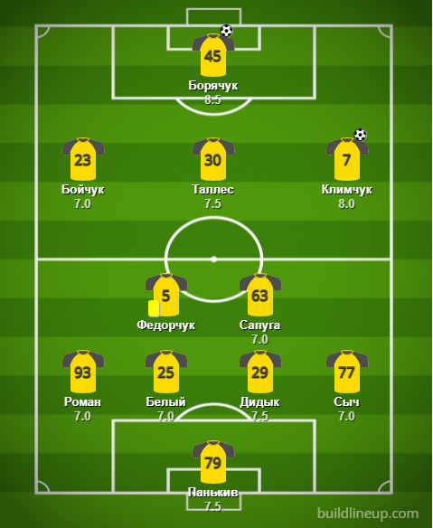 «Рух»: Панькив, Сапуга (Карасюк, 78), Таллес, Федорчук (Мартынюк, 68), Дидык, Климчук (Рунич, 78), Сыч, Борячук (Карабин, 89), Роман, Бойчук (Альваренга, 68) Белый