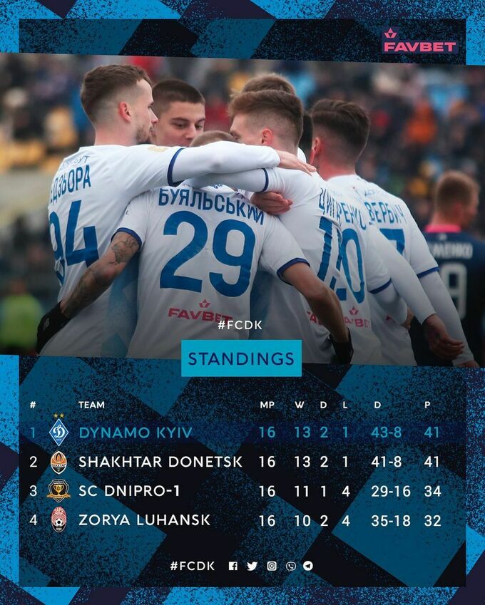 «Динамо» и «Шахтер» имеют по 41 очку. Киевляне опережают главного соперника по разнице мячей (всего на 2 мяча). У бело-синих разница: 43–8, а у горняков: 41–8.