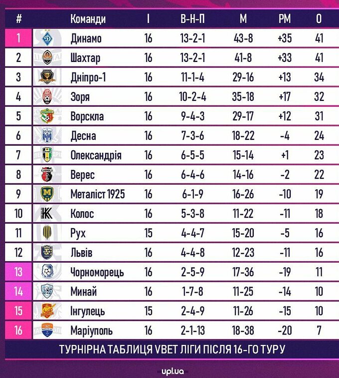 «Днепр-1» занимает третью позицию (34), луганская «Заря» отстает на два балла (32). Замыкает турнирную таблицу УПЛ «Мариуполь» (7 пунктов).