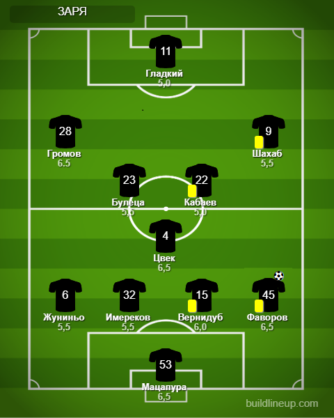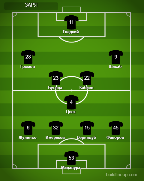 «Заря»: Мацапура - Фаворов, Вернидуб, Имереков, Жуниньо - Булеца, Цвек, Кабаев (Алибеков, 90) - Шахаб (Фримпонг, 90), Гладкий, Громов.