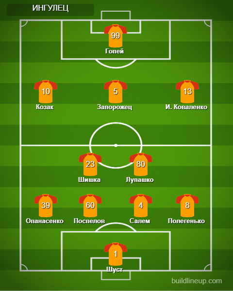 «Ингулец»: Шуст - Полегенько, Салем, Поспелов, Опанасенко - Лупашко, Шишка - И. Коваленко (Смоляков, 83), Запорожец, Козак (Коробенко, 87) - Гопей (Бартулович, 79).