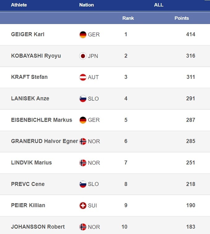 Прорыв Рёю на второе место в общем зачете случился в том числе и благодаря неудаче ряда его прямых конкурентов. У Анже Ланишека после долгожданной победы в Руке пошел спад в результатах: 13-е место в Висле, 20-е и 23-е места в Клингентале. При этом отметим, что этап в Клингентале провалила вся сборная Словении: за два личных старта лишь одно попадание в топ-15 – седьмое место Цене Превца в воскресном турнире.