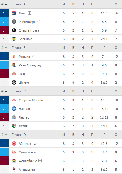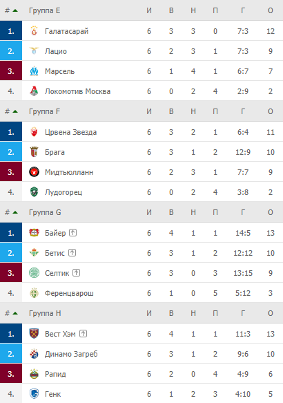 Зеленый цвет – вышли в 1/8 финала ЛЕ, бирюзовый – в 1/16 финала ЛЕ (нижняя восьмерка – перешла из ЛЧ).