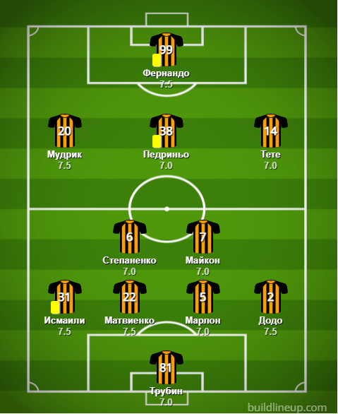 «Шахтер»: Трубин, Додо, Марлон, Матвиенко, Исмаили, Степаненко, Майкон (Маркос Антонио, 66), Мудрик (Бондаренко, 88), Тете (Соломон, 66), Педриньо (Конопля, 88), Фернандо (Мораес, 75)