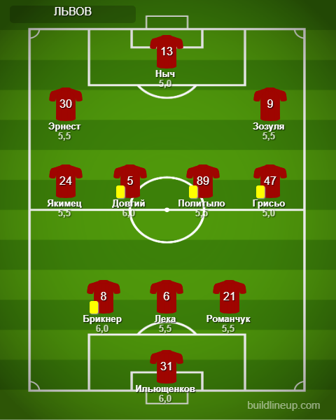 «Львов»: Ильющенков - Романчук, Лека, Брикнер (Ременяк, 69) - Грисьо (Семенив, 77), Политыло, Довгий, Якимец - Зозуля, Ныч (Шина, 77), Эрнест (Бусько, 85).