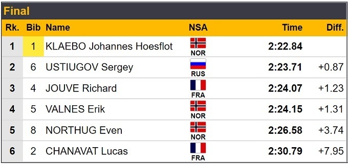Норвежский лыжник Йоханнес Клэбо выиграл коньковый спринт на этапе Кубка мира в швейцарском Давосе. В финале опередил россиянина Сергея Устюгова и француза Ришара Жува.