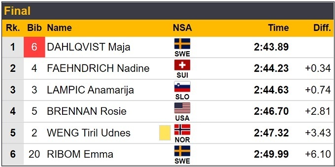 У женщин свою третью победу в трех спринтах нынешнего сезона одержала Майя Дальквист. Она опередила хозяйку трассы Надин Фэндрих и словенку Анамарию Лампич.