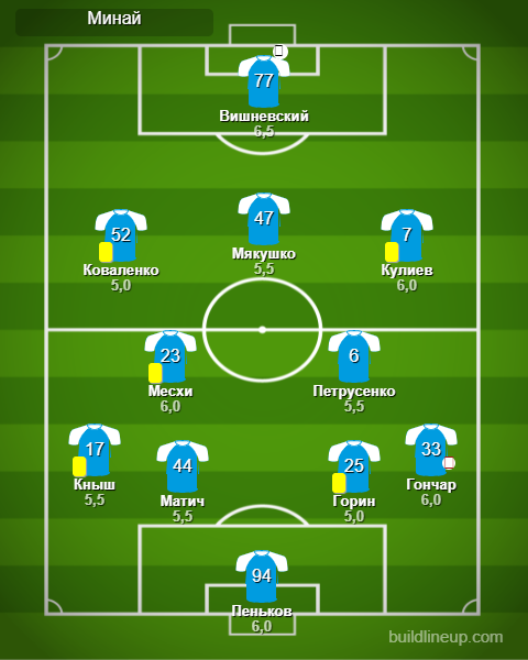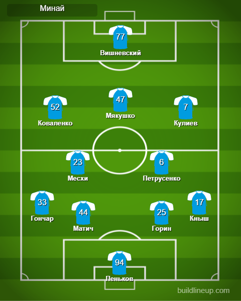 «Минай»: Пеньков, Гончар (Векляк, 25), Горин, Матич, Кныш, Петрусенко, Месхи, Кулиев (Кобак, 83), Мякушко, Коваленко (Байдал, 83), Вишневский (Селезнёв, 62).