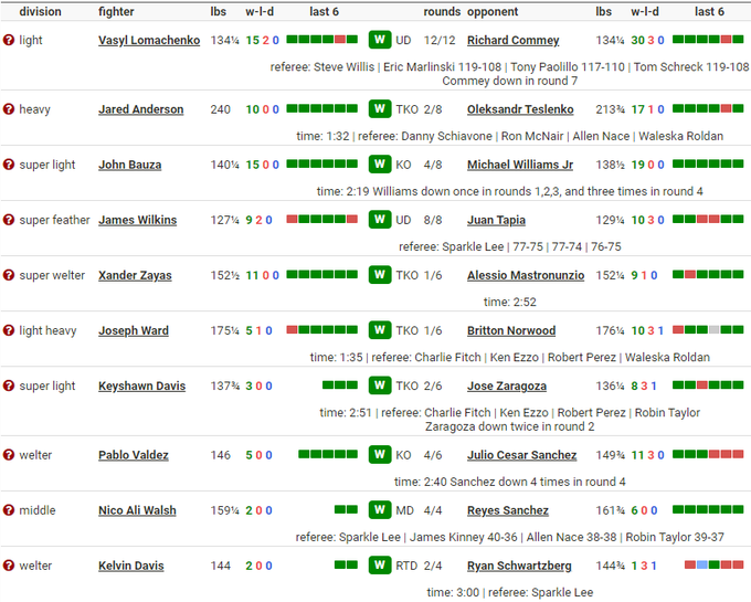 33-летнийВасилий Ломаченко (15–2, 11 КО), экс-чемпион мира в легком весе, сражался против 34-летнего Ричарда Комми из Ганы (30–3, 27 KO), который ранее владел главным поясом IBF. На кону стоял пояс интерконтинентального чемпиона по версии WBO.