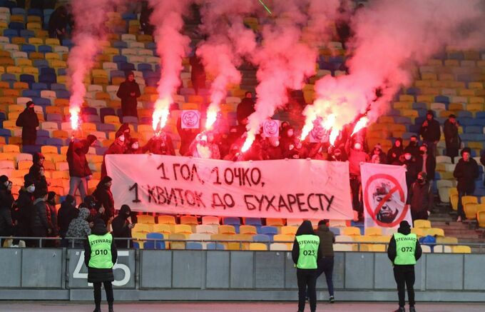 «1 гол, 1 очко, 1 билет в Бухарест», – гласит надпись на баннере, посвященном неудачному выступлению киевлян в Лиге чемпионов.