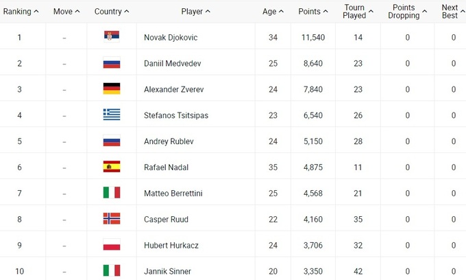Ассоциация теннисистов-профессионалов опубликовала обновленный рейтинг.