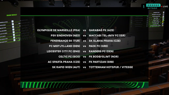 Пражская «Славия», за которую выступает украинец Тарас Качараба, будет играть против «Фенербахче» из Турции. «Карабах» из Азербайджана в борьбе за выход в 1/8 финала встретится с французским «Марселем».