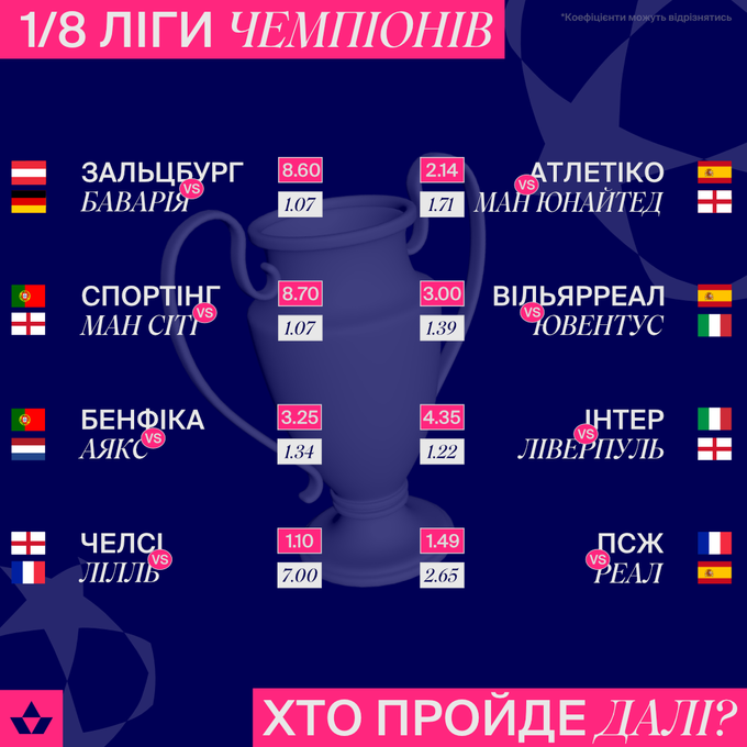 Сегодня состоялась (пусть и со второй попытки) жеребьевка 1/8 Лиги Чемпионов. Украинские команды уже покинули турнир, но и без них, наверняка, каждый найдет за кого поболеть. Ярких пар немало. Первые матчи состоятся 15 и 16 февраля, ответные – 8 и 9 марта. Favbet определился с фаворитами в каждой из них, и на победу в турнире в целом. Смотрим!