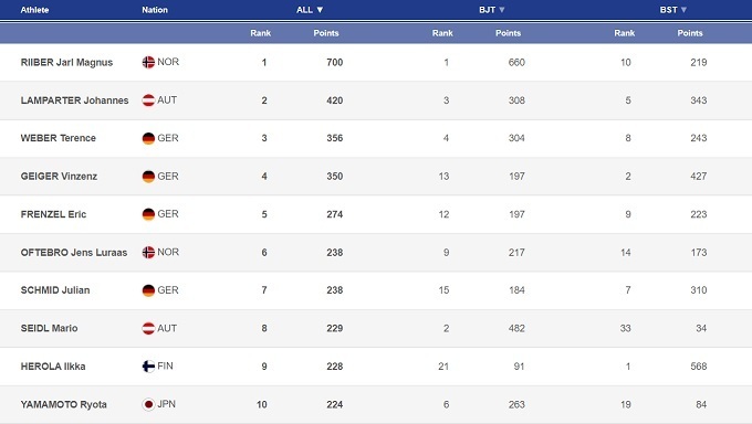 А вот ближайший преследователь Риибера в общем зачете, Йоханнес Лампартер, этап в Рамзау занести себе в актив точно не может – 4-е и 11-е места. При чем в воскресенье молодой австриец провалился именно в прыжке, где показал очень скромный по своим меркам 26-й результат. При чем и в субботу на трамплине Йоханнес выступил слабо – 17-е место. А вот в лыжной гонке на счету Лампартера 3-й и 4-й результаты – неужели у австрийца начала меняться специализация?
