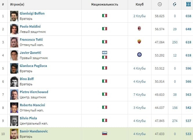 По этому показателю 37-летний словенский голкипер вошел в топ-10 в истории Серии А. В ближайшее время Ханданович может также опередить Сильвио Пиолу (537 матчей) и Роберто Манчини (541 матч).