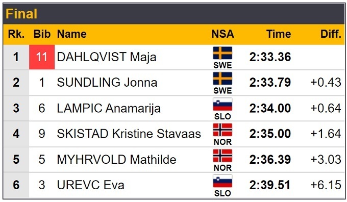 У женщин четвертую победу в четырех спринтах нынешнего сезона одержала Майя Дальквист. В финале шведка опередила партнершу по команде Йонну Сундлинг и словенку Анамарию Лампич.