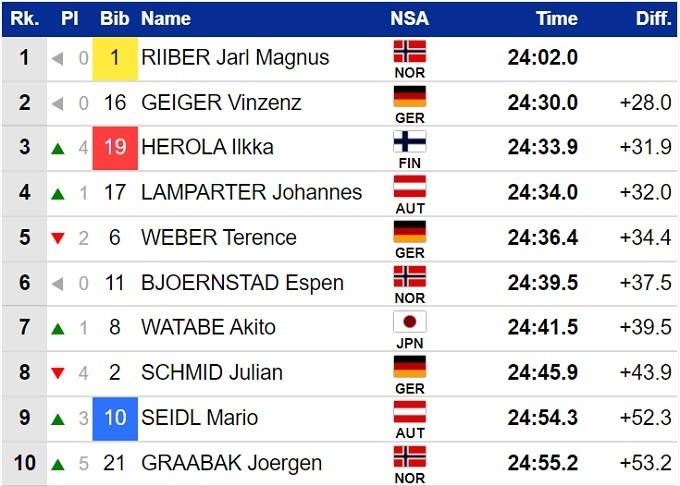 Норвежский двоеборец Ярл Магнус Риибер выиграл первый личный старт на этапе Кубка мира в австрийском Рамзау. Он опередил немца Винценца Гайгера и финна Илкку Херолу.