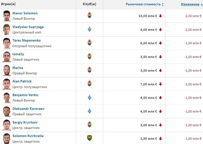 Что касается регресса, то больше всего утратили в цене вингер «Шахтера» Манор Соломон и нападающий «Динамо» Вячеслав Супряга (-2 млн евро). Также тенденция падения цен наблюдается и у многих других игроков «горняков». Опытные Тарас Степаненко, а также Исмаили подешевели на 1,5 млн. Столько же потерял в цене и Марлос, который уже покинул клуб.