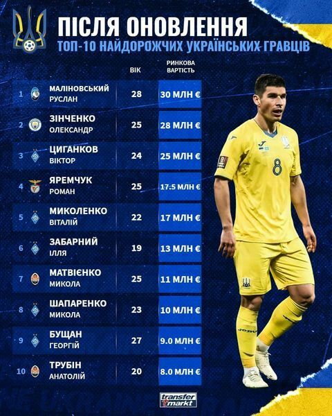 Самым дорогим игроком в списке является полузащитник итальянской «Аталанты» Руслан Малиновский, чья трансферная стоимость оценивается в 30 миллионов евро.
