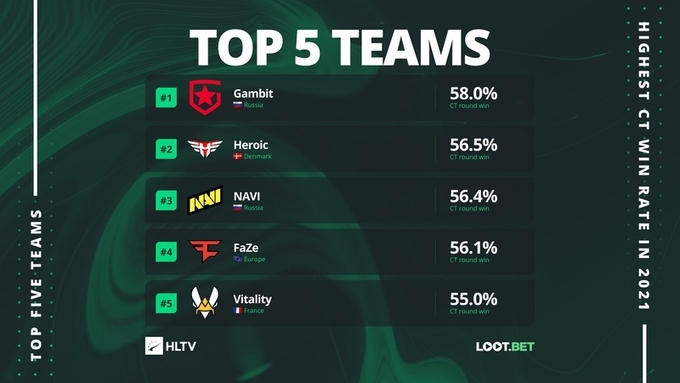 В рейтинге по винрейту в защите Gambit заняла первую строчку, а NAVI оказались на третьей.